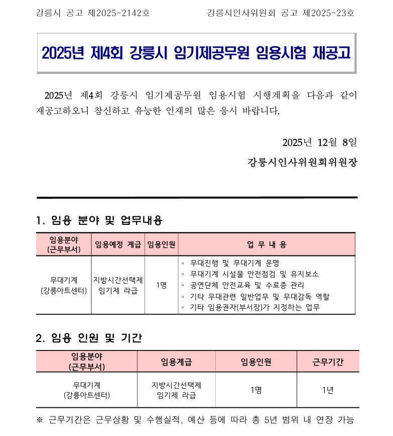 2025년 제4회 강릉시 임기제공무원 임용시험 시행계획을 다음과 같이 재공고하오니 참신하고 유능한 인재의 많은 응시 바랍니다.