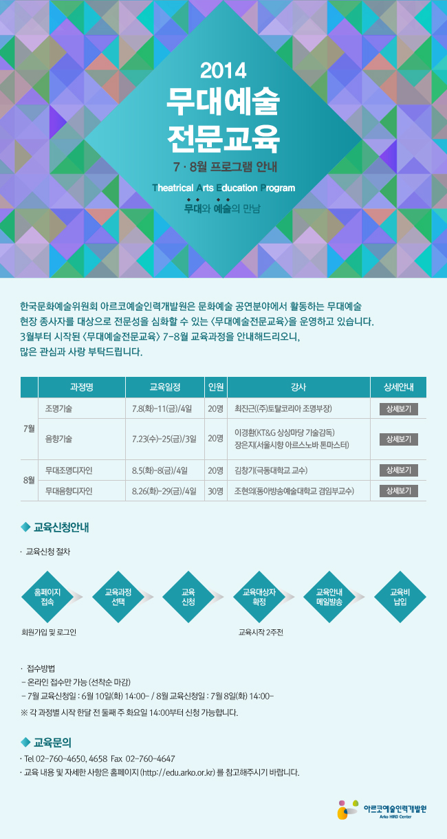 | 10 | 아르코예술인력개발원 2014년도 무대예술전문인교육 7~8월 프로그램 안내 |