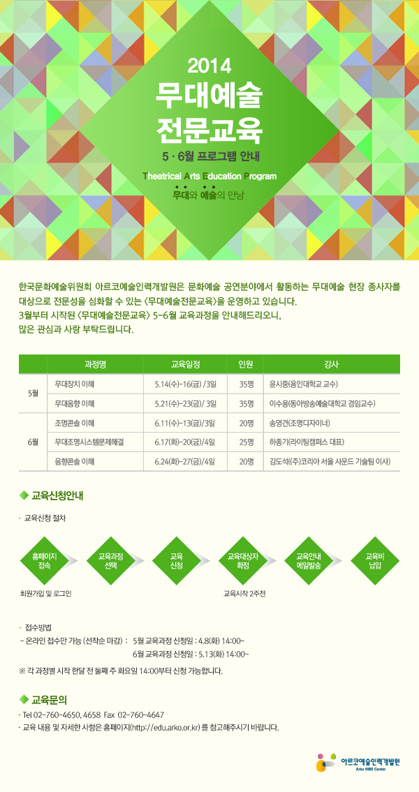 | 7 | 아르코예술인력개발원 2014년도 무대예술전문인교육 5~6월 프로그램 안내 |